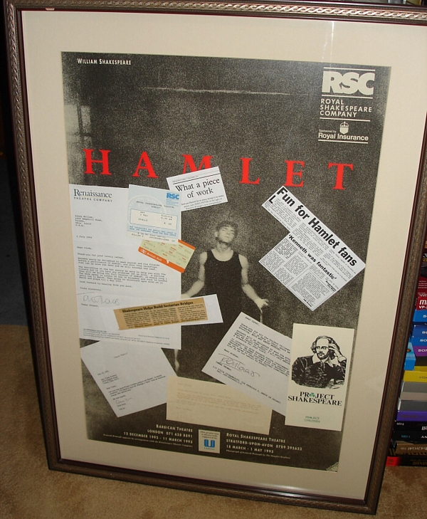 The poster and memorabilia collage (pictured below) is 26 inches by 36 inches (66 X 91 cm), matted and framed with protective glass. The poster is the official RSC poster for the 12 December 1992 – 1 May 1993 production of HAMLET starring Kenneth Branagh.