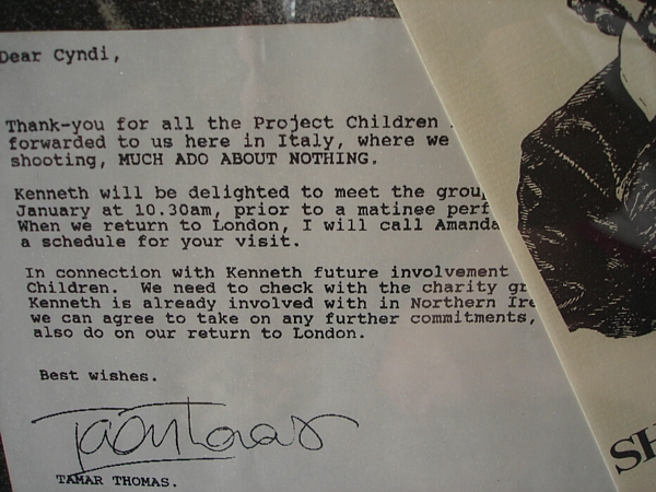 Project Shakespeare, a spin-off of Project Children in Northern Ireland, began in 1993 when 12 regular kids growing up in tough neighborhoods in Belfast and their chaperons had a private meeting with Kenneth Branagh and attended a performance of the RSC HAMLET with special tickets he provided. Cindy Millen, the co-founder of Project Shakespeare, has provided the very special item we are offering for auction.